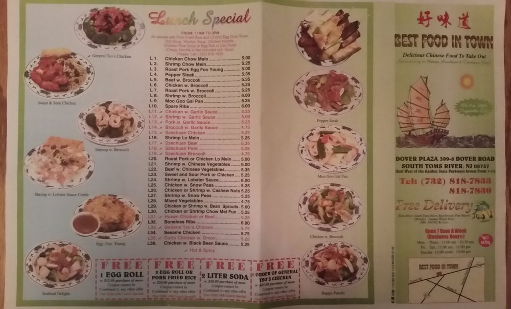 Best Food In Town Chinese Food is a Chinese restaurant located in Toms River, NJ that offers a wide range of amenities including delivery, takeout, reservations, and catering. Known for its great portions and non-greasy, delicious food, it has become a go-to spot for many customers. Reviews praise the prompt delivery service and courteous staff, making it a top choice for Chinese cuisine in the area. Dishes like house lo mein, sweet and sour shrimp, beef and broccoli, and general Tso chicken have received high praise for their freshness and flavor. Overall, Best Food In Town Chinese Food stands out for its exceptional quality and customer satisfaction, making it a must-try for Chinese food enthusiasts.